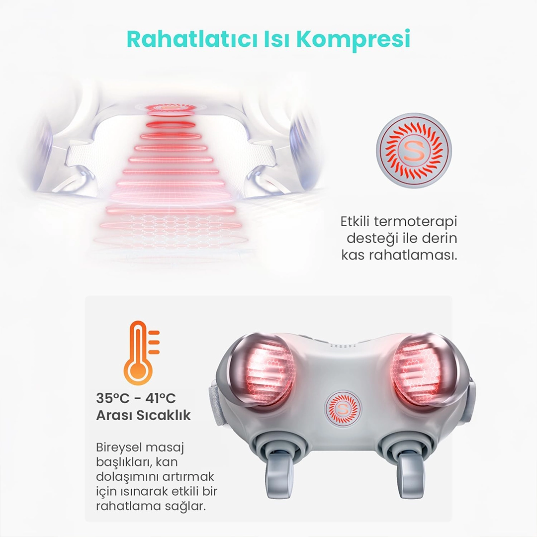 Boyun ve Omuz Masaj Aleti, geleneksel Shiatsu masaj terapisi ve kızılötesi ışık fototerapisi özellikleriyle dikkat çeker. İnsan elini simüle eden yoğurma hissiyatı ve farklı termoterapi(ısıtma) seviyeleri ile keyifli bir masaj deneyimi sunar.