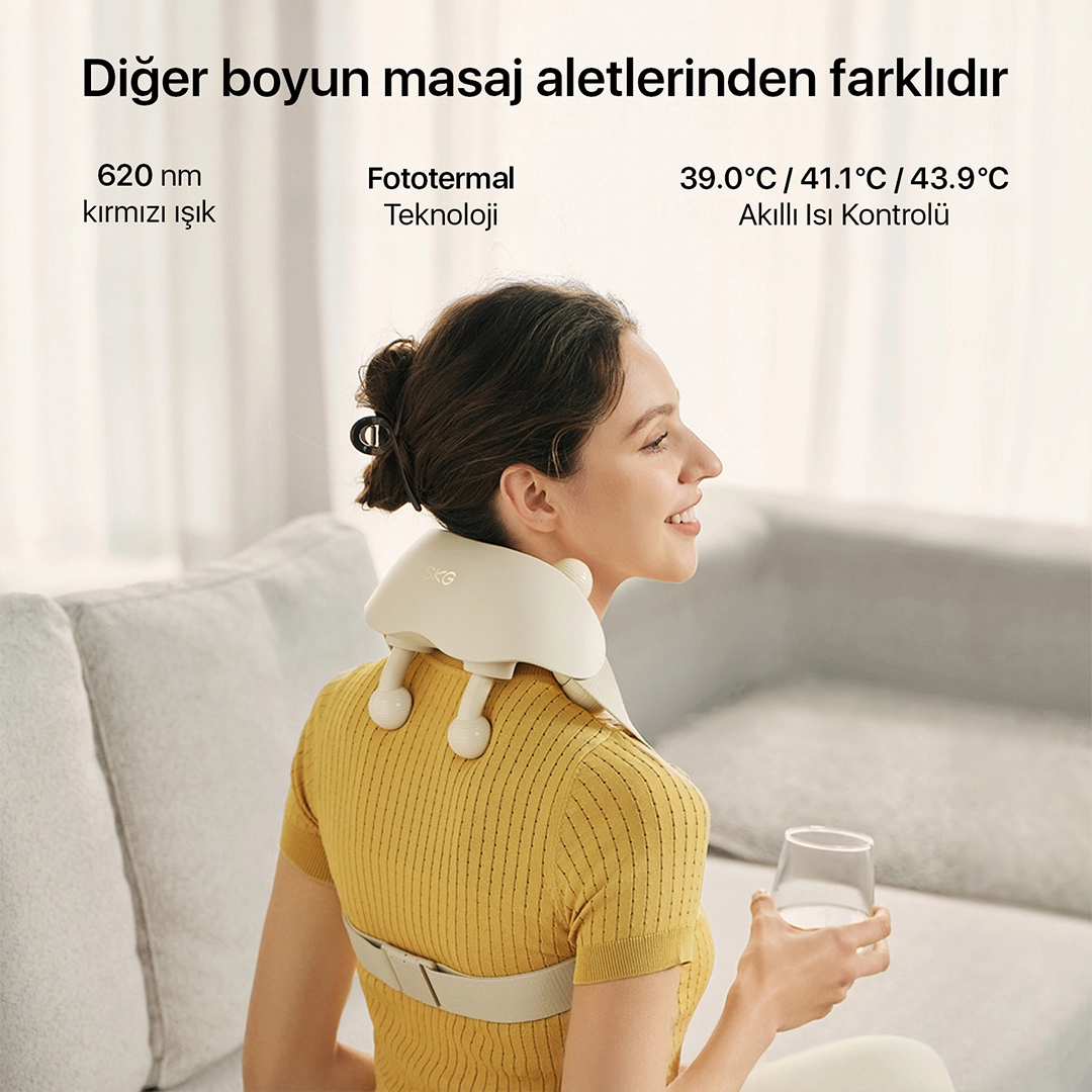 SKG H7 Ultra Boyun & Omuz Masaj Aleti, geleneksel Shiatsu masaj terapisi ve kızılötesi ışık fototerapisi özellikleriyle öne çıkıyor.