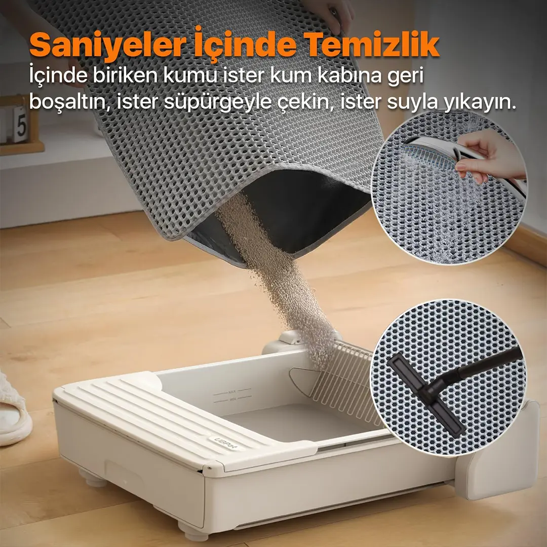 Dayanıklı, dolgulu üst elek yapısı ve yumuşak sünger dokulu alt paspası sayesinde kediniz tuvalet sonrası adımını attığında patilerinde kalan kumlar kolayca elekten geçerek alt haznede birikir.